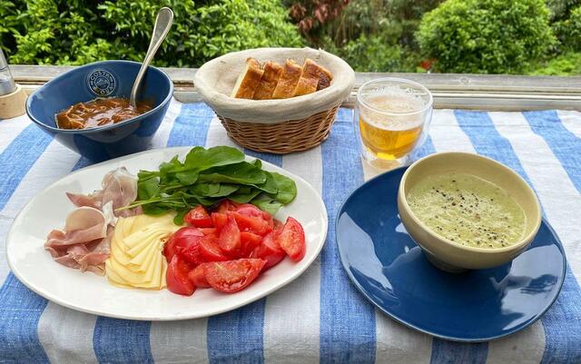 生ハム、チーズ、ルコラとトマト。ポワローのポタージュ。アフロのフォカッチャ、SUZUKIYA製のチキンカレー(レトルト)、ビール。