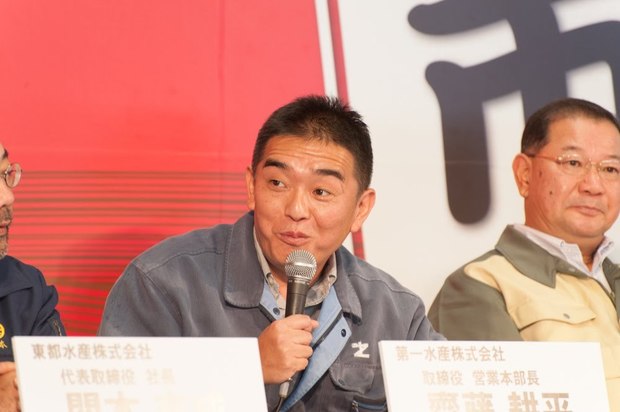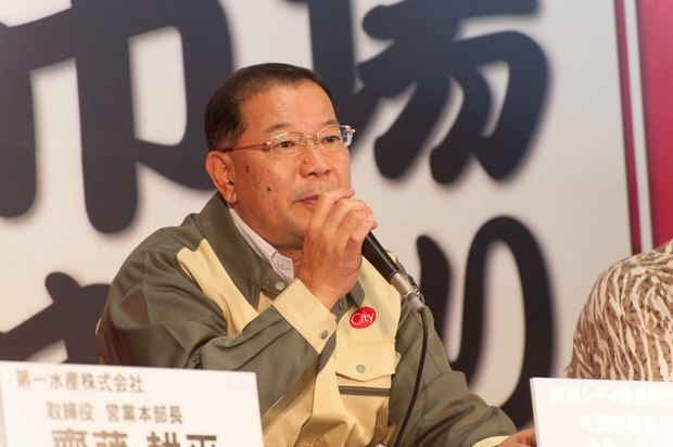 魚介類の仲卸を営む第一水産株式会社取締役営業本部長 斎藤耕平氏:「先輩方が作り上げたもの、よき伝統を受け継いで、我々は成長してきました。まだまだ成長中の築地で働いている我々は、若者の力で盛り上げていく必要がある。伝統と新しい力のコラボーレーションで、豊洲だからできることをやっていきたい」