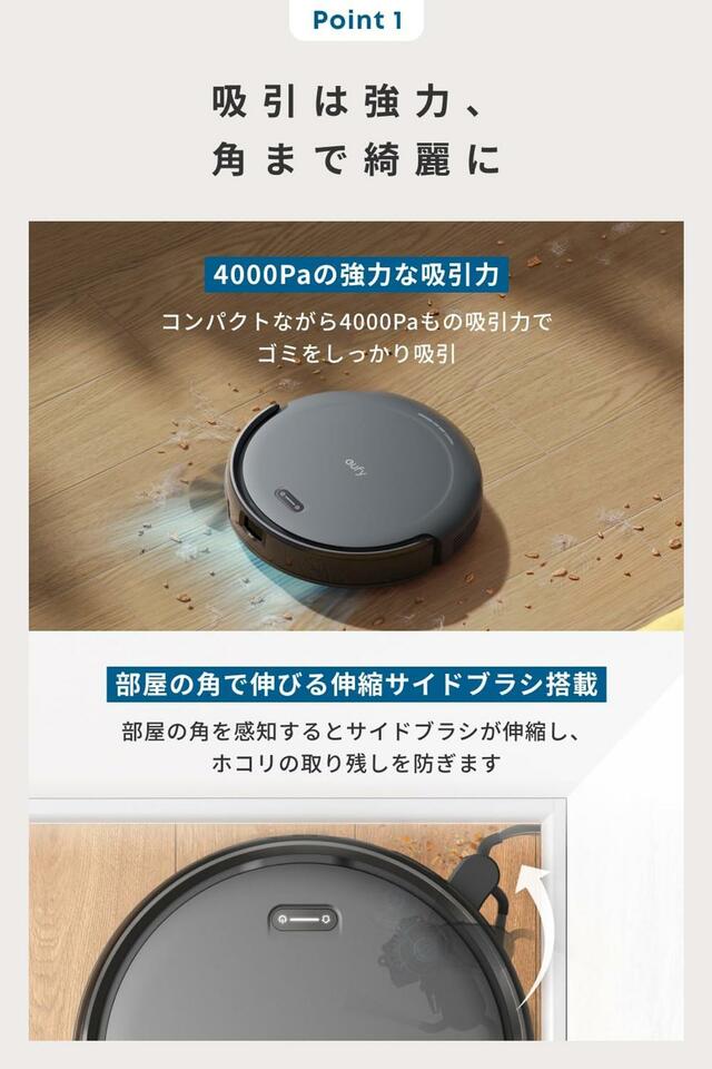 伸縮するサイドブラシをEufyで初搭載。部屋の角を認識すると本体からブラシが伸縮し、ホコリをかき出すことでゴミの取り残しを防ぎます。
