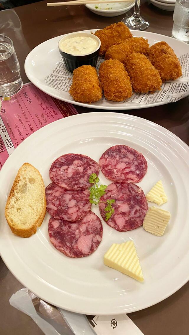 サラミソーセージ、カニクリームコロッケ(一番人気! フランスにはないらしい)、枝豆(以上を6名で食べる)。