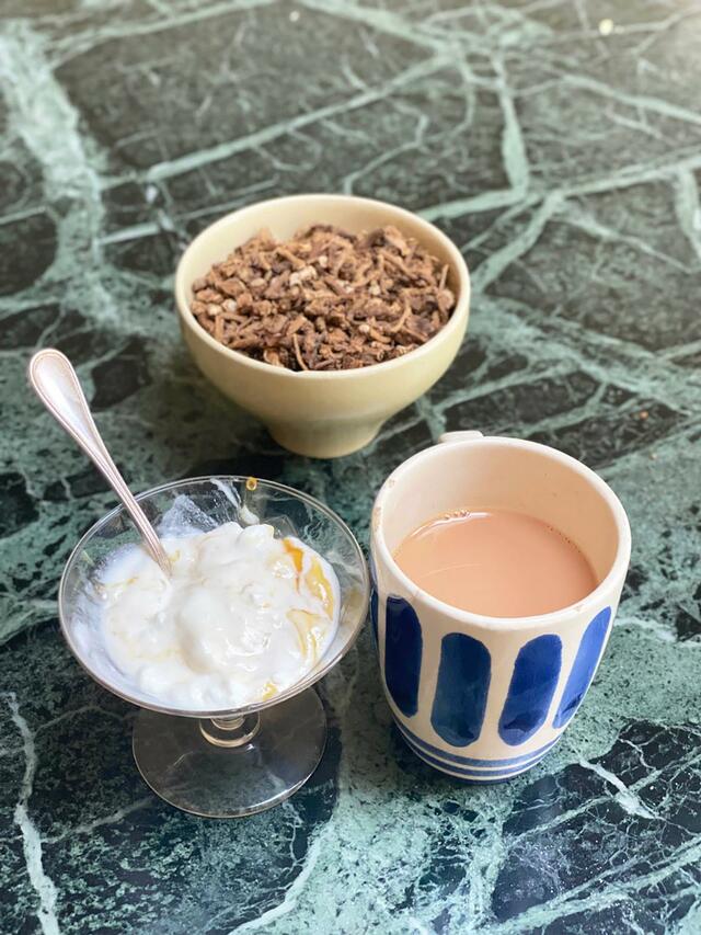 私だけミルクティーとヨーグルト(徹くんは寝ている)。奥に見える茶色のものはラディッキオの根を切って、乾燥させたもの。焙煎して砕いて「チコリコーヒー」を作る。