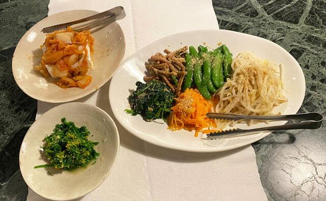 ナムル(ほうれん草、もやし、ニンジン、スナップエンドウ、ゼンマイ)も美味しくできました。チーマ・デ・ラーパのおひたし、冷奴と白菜キムチ。