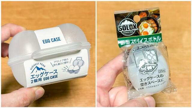 卵を少し持ち運びたいときにピッタリのセリアの「エッグケース」と「卵型スパイスボトル」。