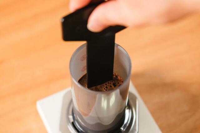 再度パドルで前後に5回攪拌したら、プシューッと音が鳴るまでゆっくりとプランジャーを押し込んで抽出します。