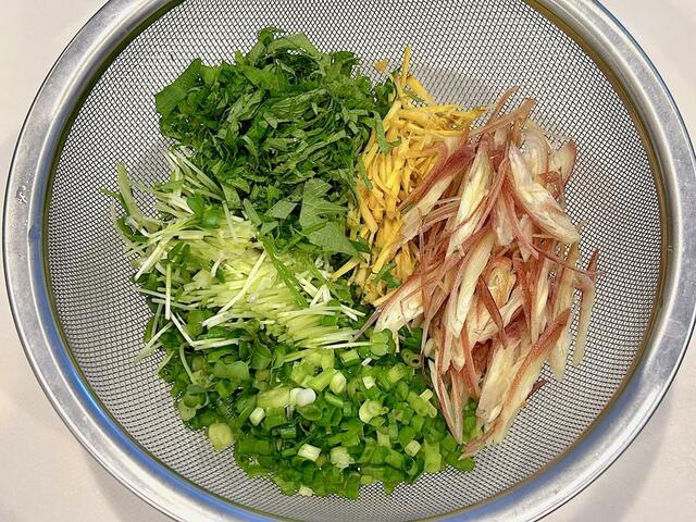 1. ねぎは小口切り、大葉は縦半分にしてからくるっと丸めて細切り、みょうがは縦半分にしてから斜めに細切り、かいわれは種を除いて2cm幅にカット。しょうがは薄くスライスしてから細切りにする。