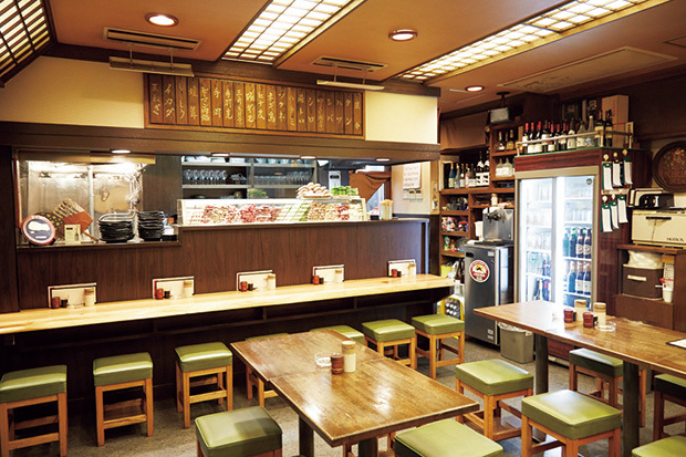 大正13年創業の老舗で、店内はカウンターのみの立ち飲みスタイル。開店前から行列ができるほど人気で、開店と同時に店内が満員になってしまうことも。ネギマやレバ—、もつ数種類をひと串に刺した「ハートスタミナ」など、4~5種類のメニューがコースで1300円。