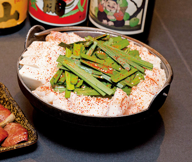 博多風のメニューが充実した居酒屋。自慢は産地から毎日直送される大山鶏を備長炭で炙った焼き鶏だ。ミディアムレアに焼き上げたやわらかな地鶏と、新鮮なタマネギがひとつの串に刺さっているのが、博多スタイル。「チーズピリ辛モツ鍋」(1280円)もこの店ならでは。