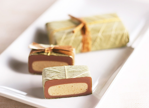 和栗のきんとんを芯にした蒸し羊羹。ホッとする上品な甘さの栗と、つるりとのどごしのいい羊羹の絶妙なハーモニーが楽しめます。また、栗と相性の良い朴(ほお)の葉で包まれているので、香りも豊か。手土産としても喜ばれます。