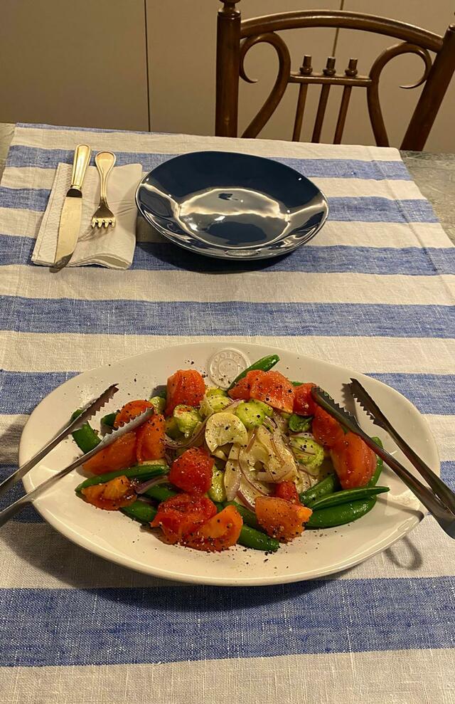 サラダ(筍、トマト、スナップエンドウ、きゅうり)。掘り立て筍の美味しいこと、美味しいこと! ありがたや、ありがたや。
