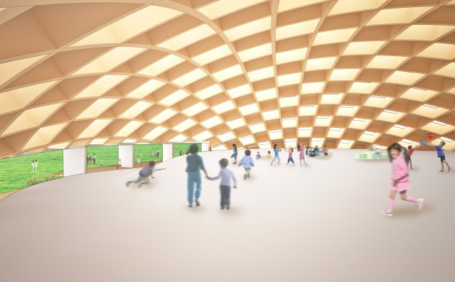 起伏のある床面と空が見える天井が特徴の遊びエリア