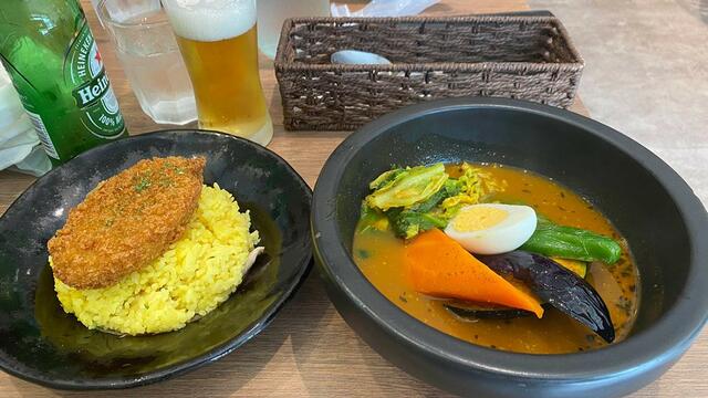 市場の中にある「北緯43度のスープカレー屋さん」でかぼちゃコロッケのスープカレー(辛さ15度)を食べる。