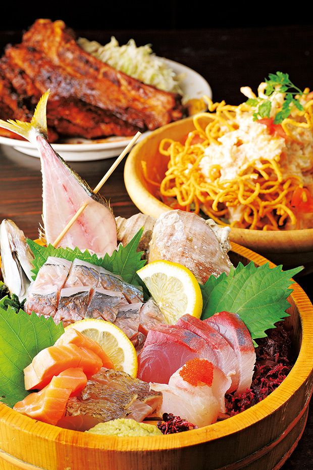 地魚鮮魚盛り合せ 1382円~ その日仕入れた旬の地魚鮮魚を盛り合わせで。内容は漁や仕入れによって替わるので、お楽しみに! 拡大画像表示