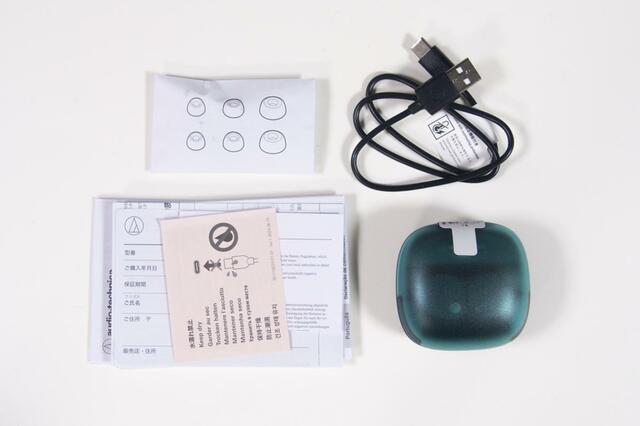 内容物はイヤホン本体、充電ケース、充電用USBケーブル、イヤーピース。(XS、S、Lサイズ Mサイズは予め本体に装着されています)