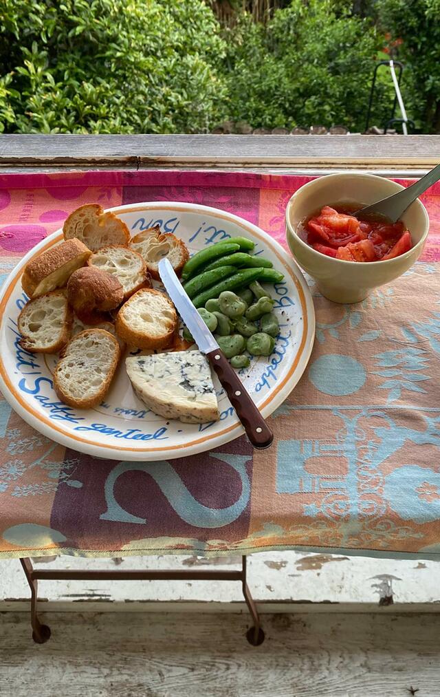 帰宅してパンとスナップエンドウ、空豆、チーズ、