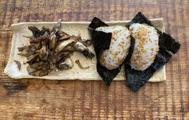 おにぎり(梅干しと明太子)+舞茸の油炒め。
