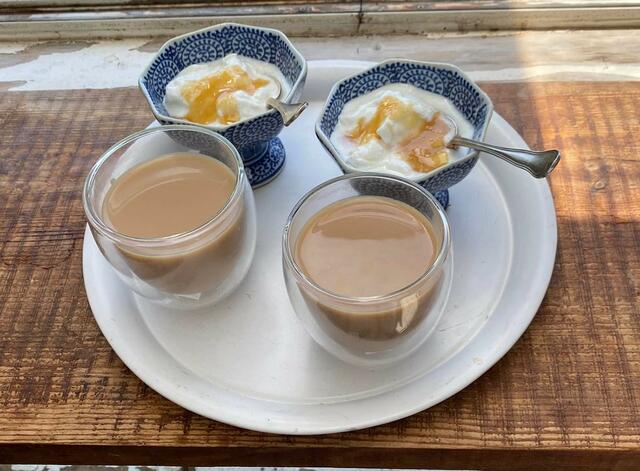 昨夜飲みすぎたか? ちょっと二日酔い。ミルクティとヨーグルト。