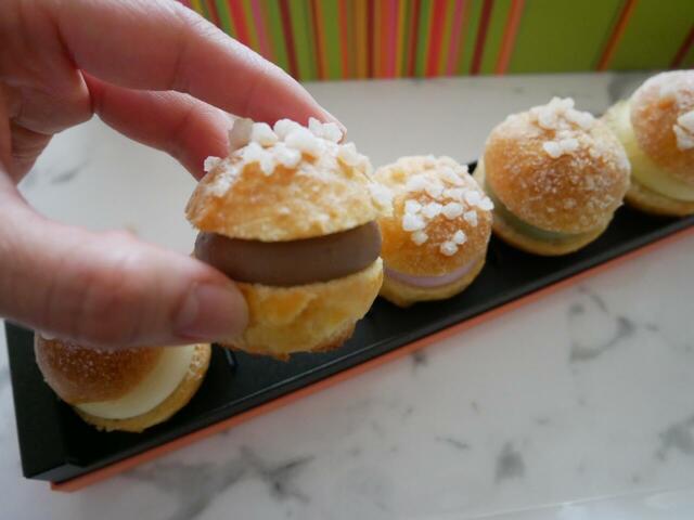 クリームはトロペジェンヌによく使われているカスタードではなく、シェフパティシエが独自に開発した生クリーム、マスカルポーネ、オレンジブロッサムウォーターと少しのゼラチンを配合した、新感覚のクリーム。