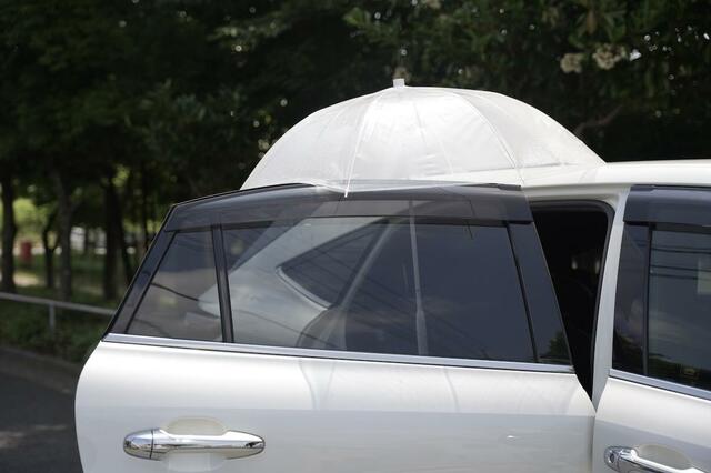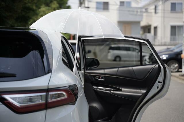 傘が車にくっついてくれるのですが、傘よりもドアの方が大きいので、ドアの端は雨に濡れてしまいます……。