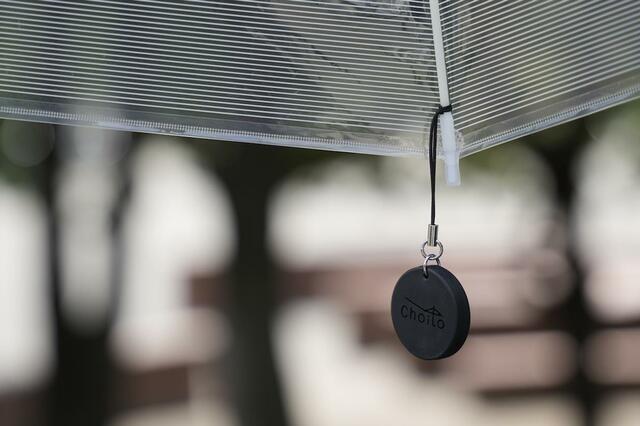 昔はケータイにストラップ付けてたな……なんて思い出にふけりながら、このストラップを傘の露先付近にくくり付けます。準備としてはこれで完了です!