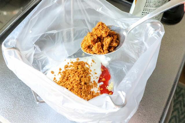 鶏肉にヨーグルトとカレールー、ケチャップ、にんにく、しょうがを入れて漬けこめば仕込み完了。
