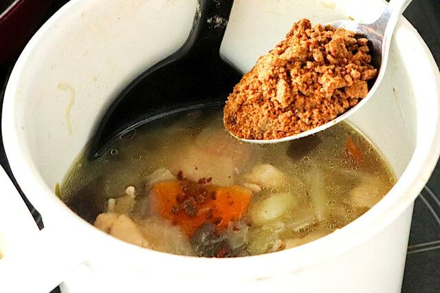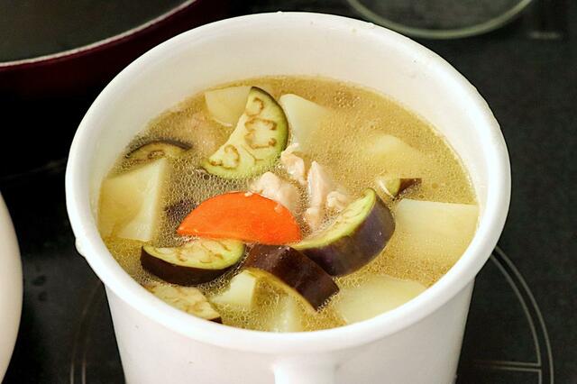 まずは一般的なカレーと同じく、野菜や肉を炒めてから煮込みます。