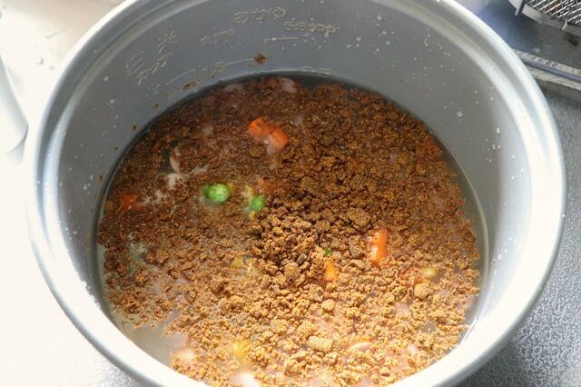 炊飯器に2合分のお米と具材、カレールーを入れて炊くと……。