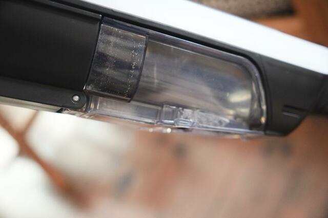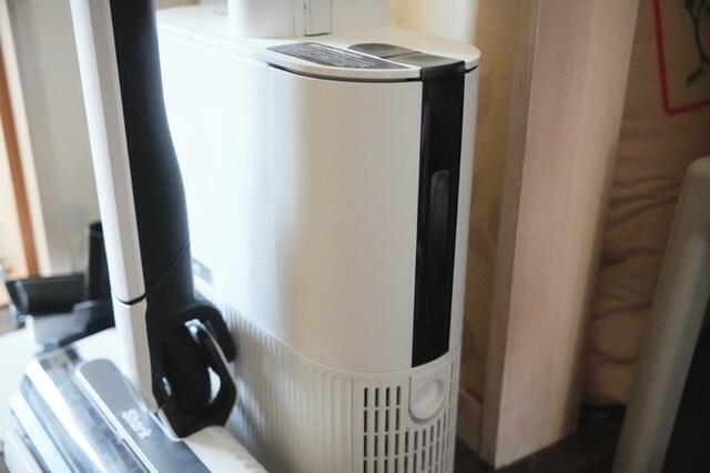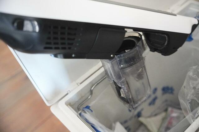 このコードレス掃除機は、掃除をすると本体上部のダストカップにゴミを収集、ワンタッチで捨てられます。ボタンを押すだけで、ゴミに触らずに捨てられるので、これはこれで便利なのですが、もっとすごかったのが自動ゴミ収集機能。