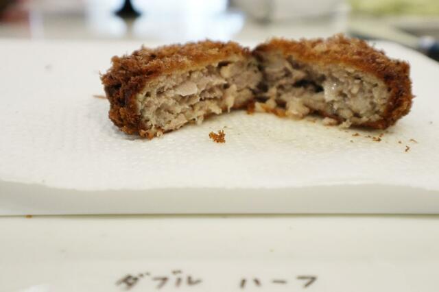 ダブルハーフで揚げたメンチカツを食べてみると、表面はサクサク、食べるとじゅわ~っと肉汁が。おいしく揚げられています。