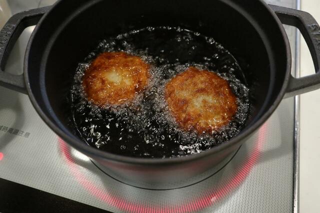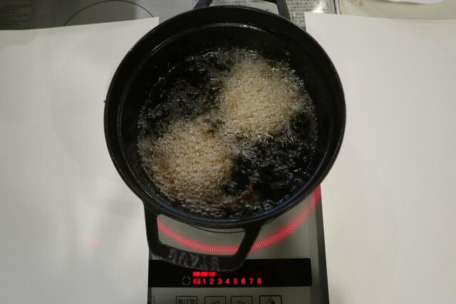 衣の中の水分が早く抜けるため、1/2の油でもカラッとおいしく揚がるそうです。