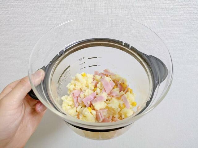 なんと! ポテサラまでできてしまう……! じゃがいもなど、野菜も蒸せるんですね。フタがあるので、ラップをかける必要もありません。蒸したあとはそのままつぶし、マヨネーズや塩で味付け。ハムやコーンなどの具材も混ぜちゃえば、この容器だけでおかず1品完成です。