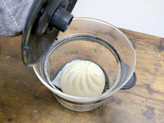 その後、内フタの上に肉まんをセット。さらに1分加熱したらふわっふわホッカホカにしあがりました〜! (加熱時間は、商品によって調整してください)