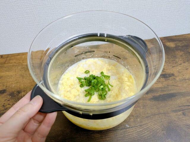 解凍した冷凍ごはんと水、溶き卵、めんつゆを本体に入れ、ちょっとかき混ぜて600W7分! これなら、ちょっと体調が悪いときでもおいしい雑炊がすぐつくれます。