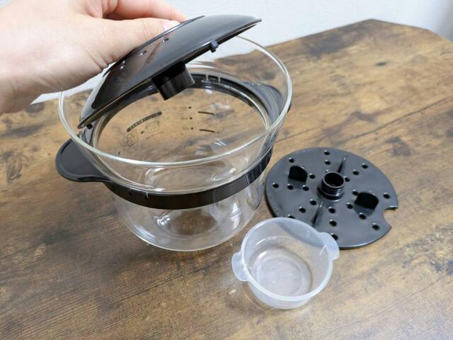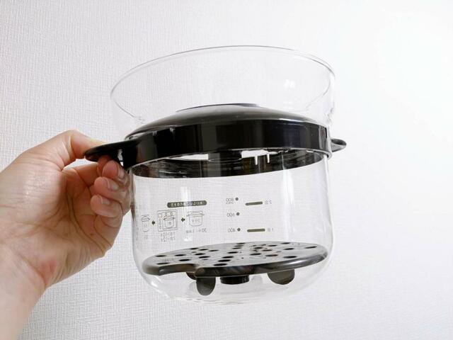 蒸す専用の容器がなくてもコレがあれば大丈夫でした! 本体に水を入れて、内フタを底にセット。まずはそのまま3分加熱します。