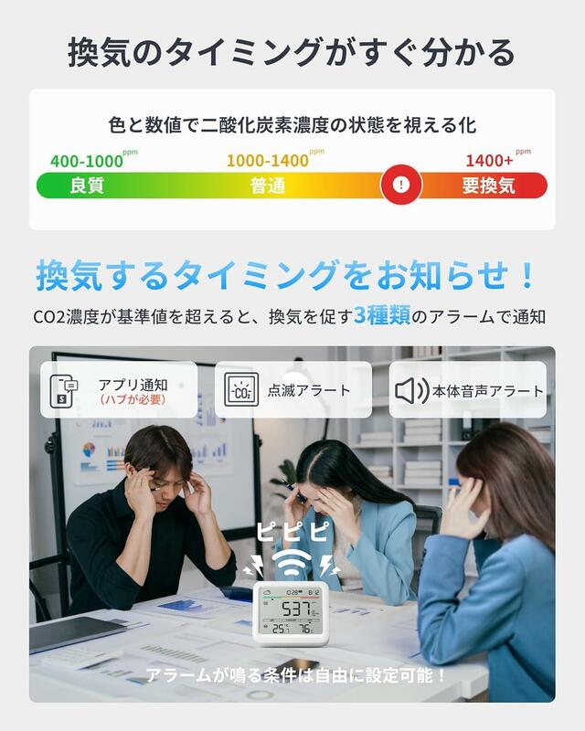 CO2濃度が設定値を超えると、本体からの警告音、ディスプレイの数値点滅、スマートフォンへの通知と3種類のアラート機能で換気のタイミングを知らせてくれるから作業に没頭していても安心です。
