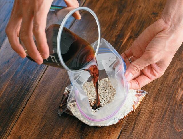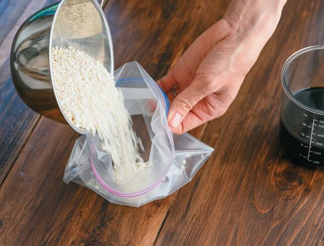 4. 保存袋の口を一部開け、炊飯器の保温モード(60℃)で6時間発酵させる。発酵を開始して2時間後に一度かき混ぜるとよい。(『がんばらないのに整う 麹ごはんと発酵あんこ』25ページより引用)