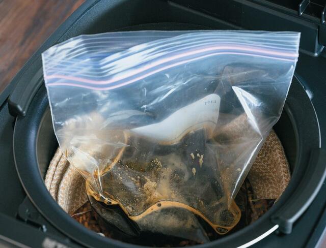 ひとつは、炊飯器に保存袋を直置きすると温度が高すぎるので、炊飯器の釜底に厚手の乾いたふきんを折り畳んで敷いて、底上げをすること。