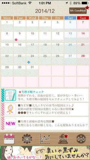 しかも、生理などの入力はワンタッチで超お手軽。続けられる工夫がされてます。