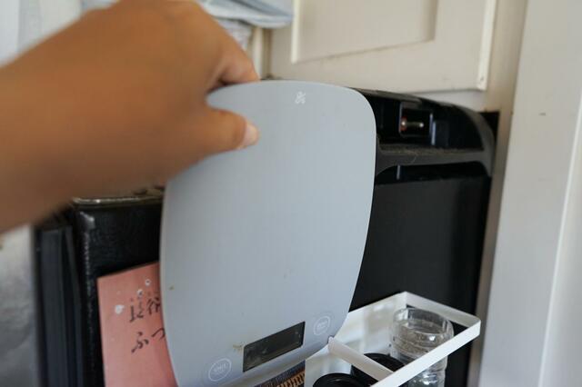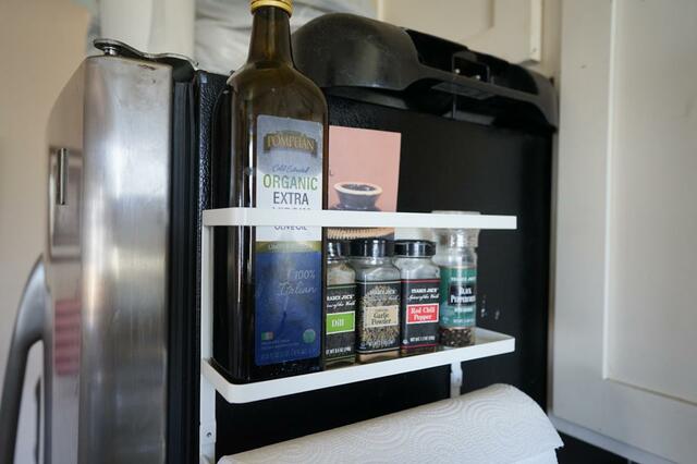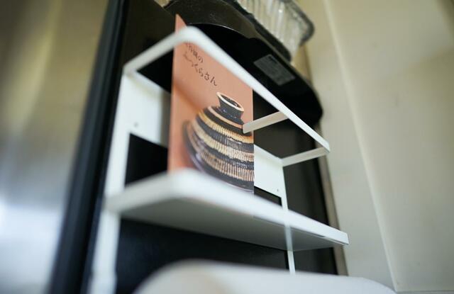 上部のラックには仕切りがあるため、調味料やラップなどを置くほか、その背面にレシピ本や薄いキッチンスケールを置けます。
