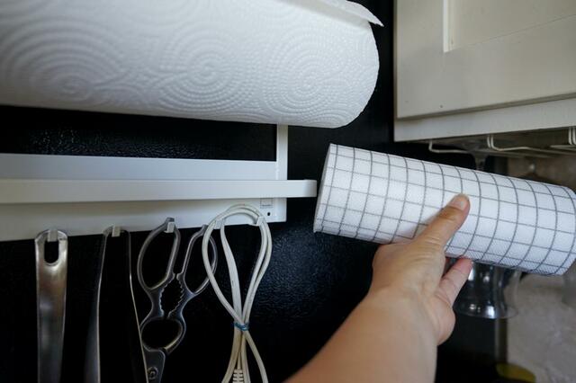 私は今まで置き場に困っていたニトリの使い捨てカット式台ふきんを収納しています。サイズがジャストフィットで、クルクル回して簡単にすぐにふきんが取れて便利!