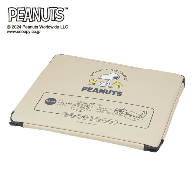 玄関先で活躍する「置き配ボックス『スヌーピー』」。やさしいベージュカラーに、スヌーピーとウッドストックのさりげないイラストがポイントです。