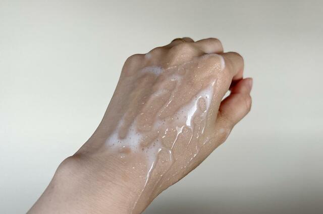 シュワッと泡が溶けてなくなるというよりかは、とろみのある液体に変化。モコモコの泡からとろりとした美容液のテクスチャーに変化する過程が、新感覚で癖になるんですよね〜。