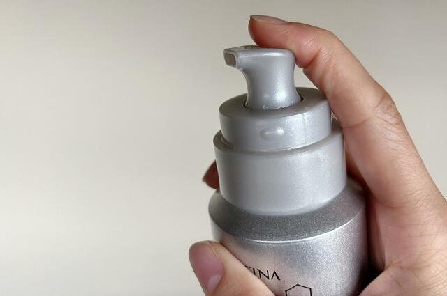 まずは容器をよく振ってから、頭部を上にして適量手に出し、肌にのせます。