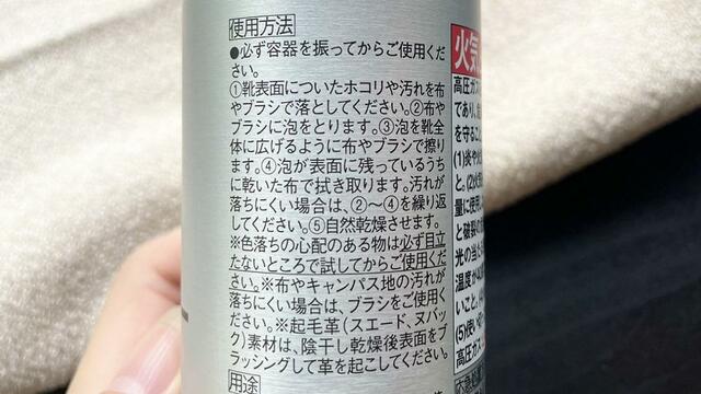 起毛革(スエード、ヌバック)素材は、陰干し乾燥後に表面をブラッシングして革を起こすこと、などの注意事項もボトル裏に書かれています。