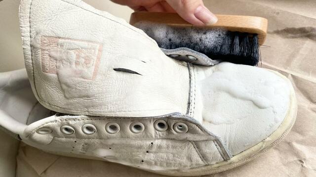 次に、布やブラシに泡を取り、靴全体に広げながら、布やブラシでこすっていきます。