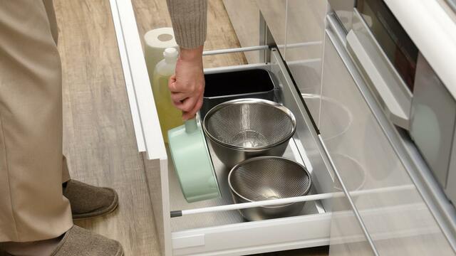シンク下に収納する場合も、取っ手が上を向くのでかがまずに取り出せます。