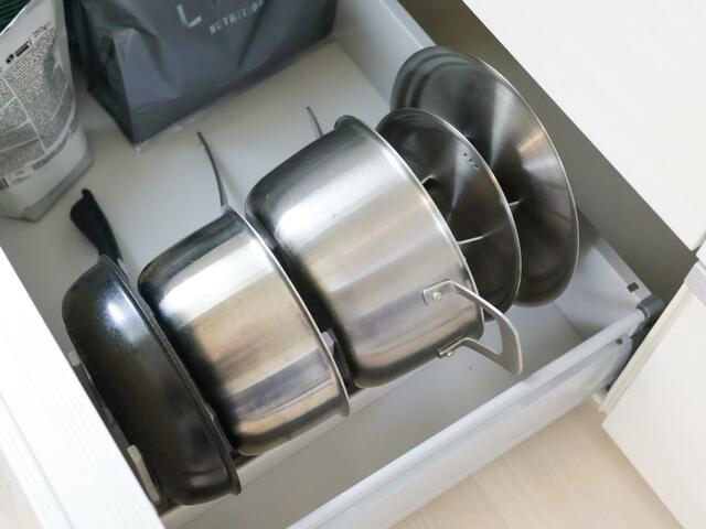 収納場所に困っていた、鍋やフライパン、鍋蓋を収納するとこんな感じ。