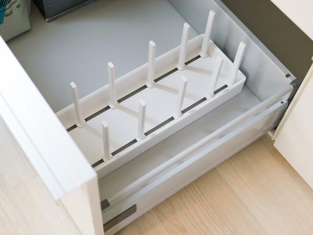 そうすると、右は鍋類、左はプロテイン置き場……といったように、大きな引き出しの空間を有効活用できるのです。