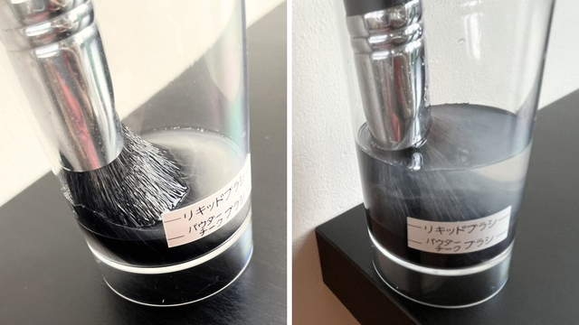 「熊野筆リセッター」で洗ったブラシは、バサバサだった手触りがなめらかに変わっただけでなく、見た目が全然違う!