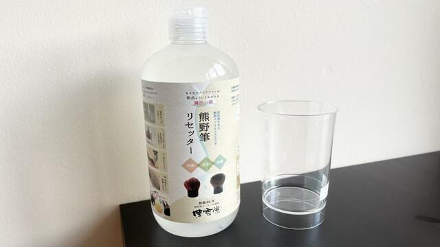 使い方は簡単。まずは付属の専用のカップに「熊野筆リセッター」を注ぎます(写真左)。