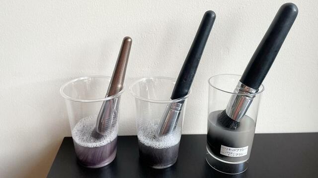 こちらは水を足して浸け置きしている状態のブラシ。左から順に、シャンプー、中性洗剤、「熊野筆リセッター」です。